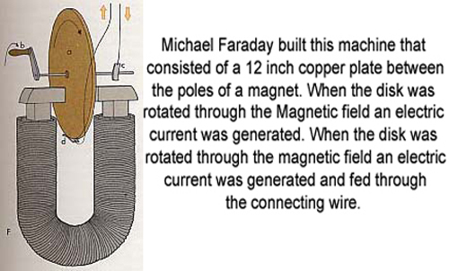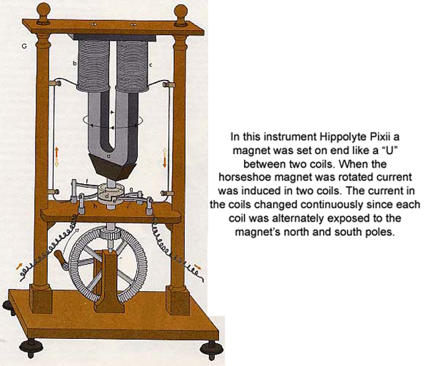 It important to note that it is necessary to rotate something inside a magnetic field to generate current. To illustrate this principle, Faraday built a machine (Click here) that consisted of a 12 inch copper plate between the poles of a magnet. When the disk was rotated through the magnetic field an electric current was generated and fed through the connecting wire. Another generator was devised by Hippalyte Pixii, a French instrument maker (Click here) A magnet was set on end like a U beneath two coils of wire. A shaft connected to the magnet to geared wheels and to a hand crank which spun the magnet on its axis.
