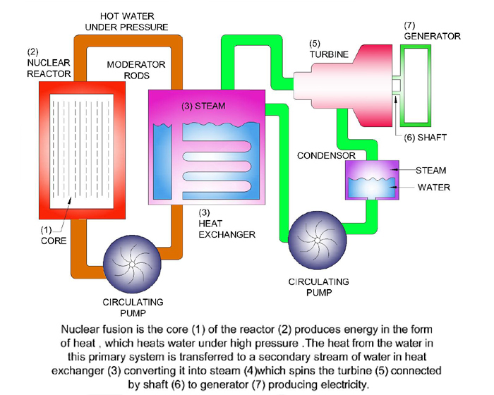 Nuclear fission power systems contain nuclear reactors which "burn" nuclear material whose atoms are split, causing the release of heat.  The heat from the fission process is used to change circulating water into steam.