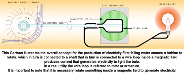 The cartoon (Click here) illustrates the overall concept. First falling water causes a turbine to rotate, that is connected to a shaft that rotates, which in turn is connected to a wire loop inside a magnetic field which produces current that generates electricity to light the bulb. In a real utility plant the wire loop is referred to as a rotor or armature.